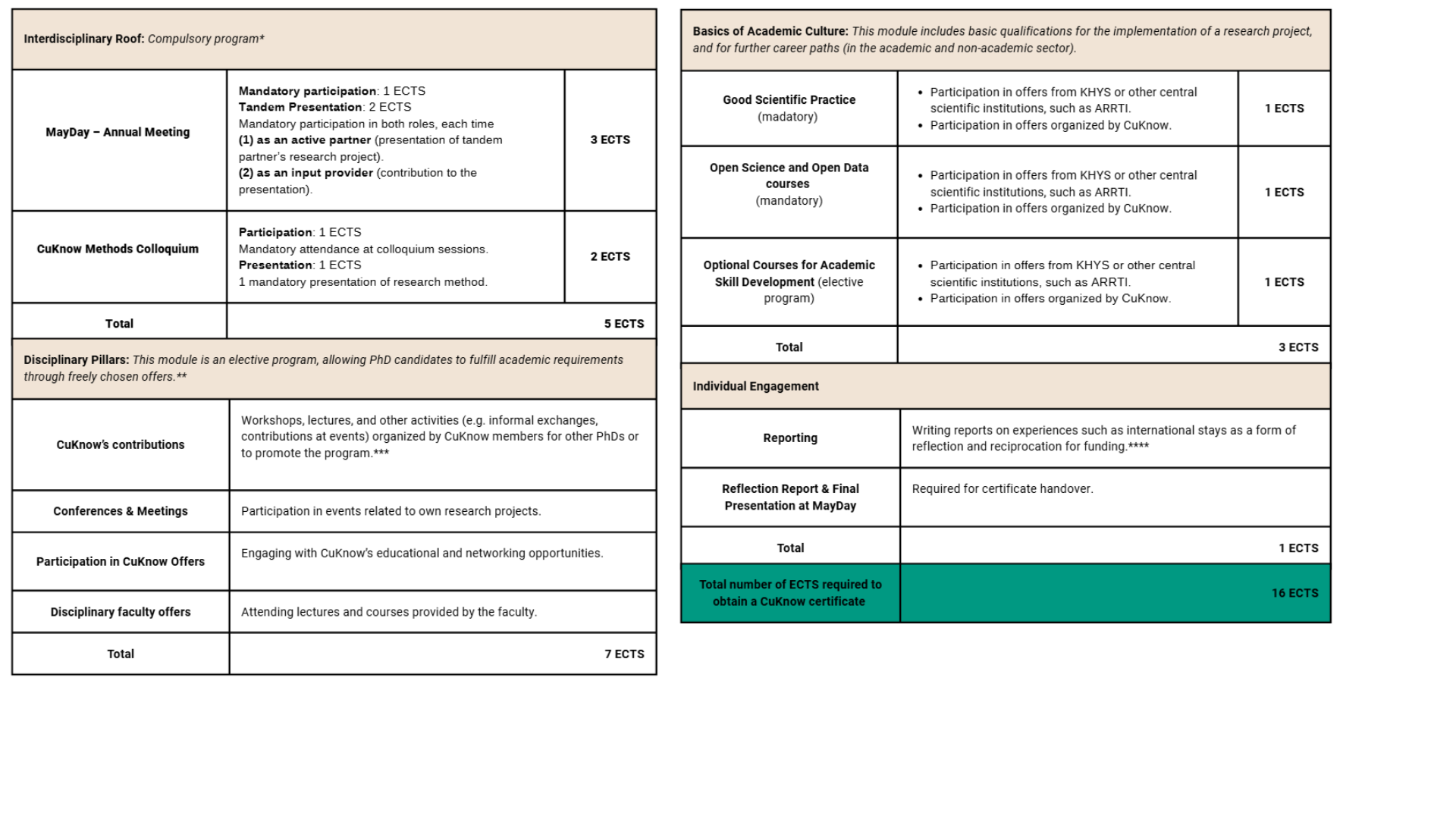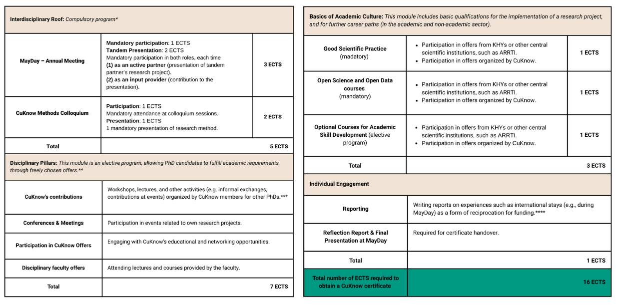 Im Grundlagenprogramm werden einerseits Basisqualifikationen für die Durchführung eines Forschungsprojekts und die Promotion vermittelt, andererseits Kompetenzen und Bausteine für weitere Karrierewege (innerhalb und außerhalb der Wissenschaft) geschaffen. Zu diesem Zweck arbeitet die Graduiertenschule CuKnow eng mit dem Karlsruhe House of Young Scientists (KHYS) und der KIT Academy for Responsible Research, Teaching, and Innovation (ARRTI) zusammen.